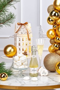 W skład zestawu wchodzą wyłącznie produkty wymienione w opisie. Kieliszki, bombki, dekoracje oraz talerze widoczne na zdjęciach służą wyłącznie jako element aranżacji i nie są częścią prezentu.
