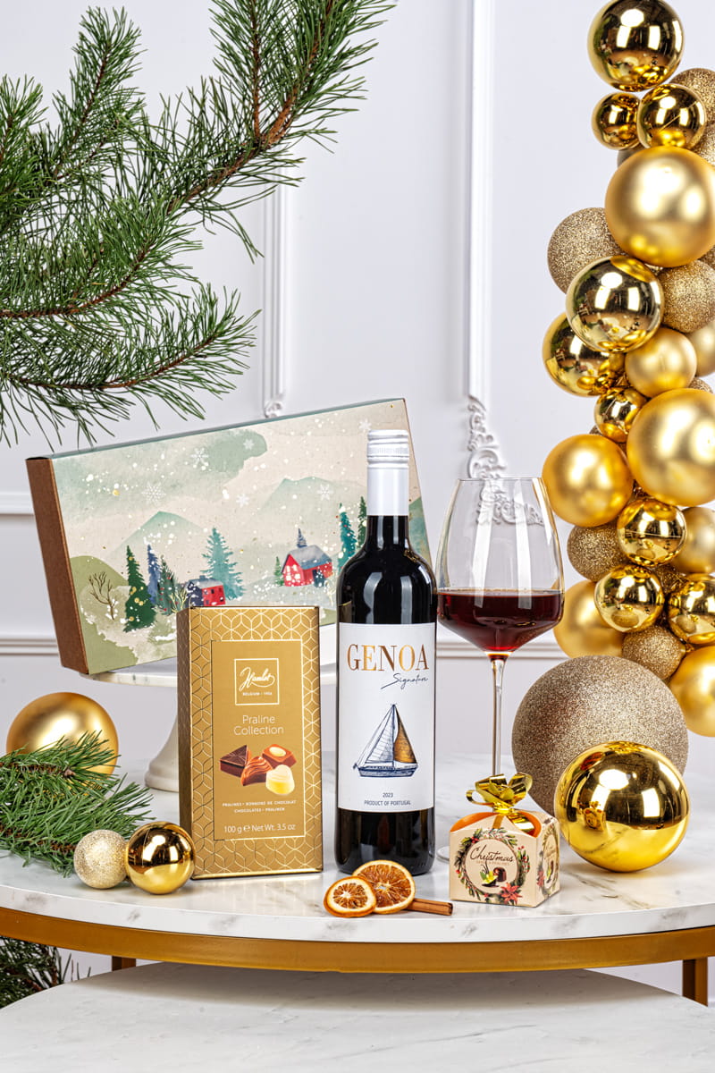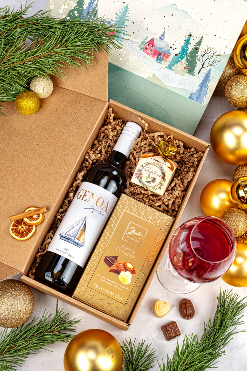 Zawartość dobrano tak, by zestaw był uniwersalny i „bezpieczny” smakowo: czerwone wino jako główny akcent, plus markowe praliny i słodkie cukierki jako dodatek. Całość zapakowana jest w ekologiczne, prostokątne pudełko typu kraft (SNOWY COUNTRY GF005P) z dekoracją świąteczną, gotowa do wręczenia.